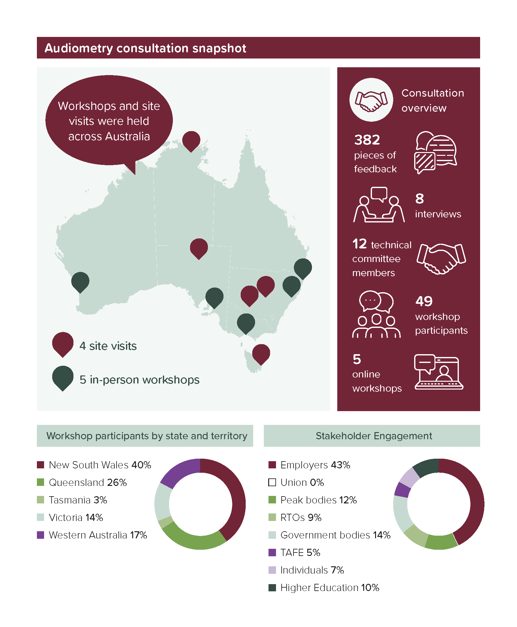 We collected feedback through workshops, surveys, site visits, e-mails and subject matter experts (SME) meetings. Workshops were held online and face to face around Australia, engaging multiple stakeholders in metro and regional areas, allowing diverse stakeholder perspectives to be captured. View our Consultation Strategy.