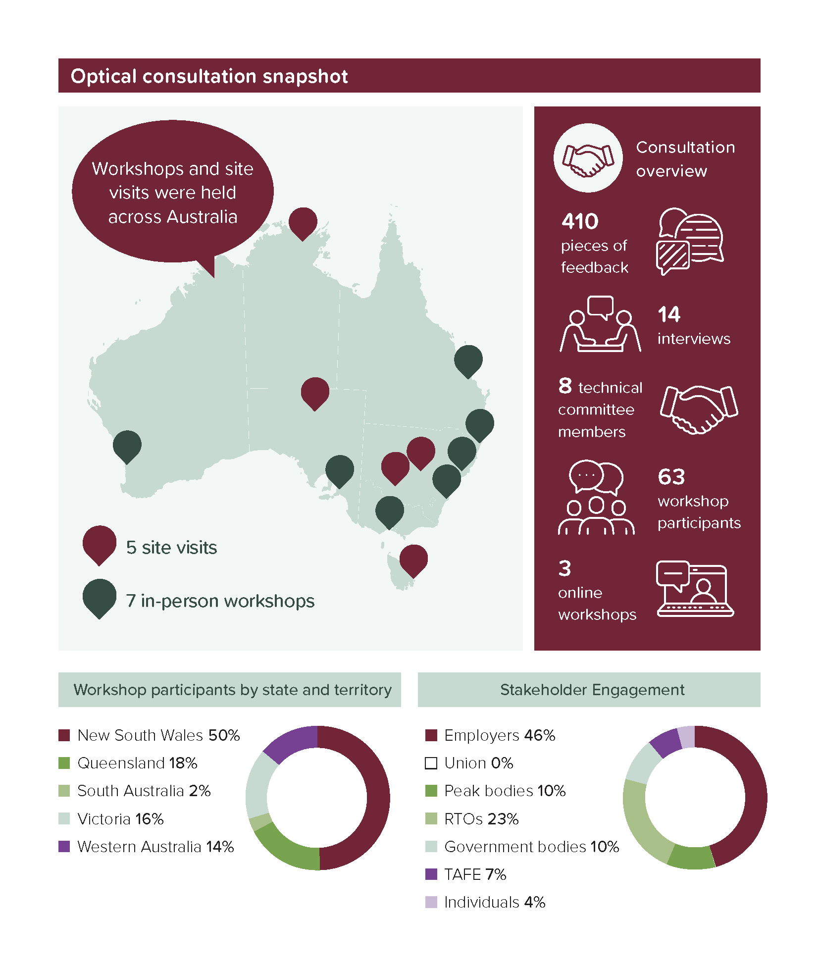 All training products have been reviewed and updated based on a thorough analysis of feedback received throughout the consultation process from a wide range of stakeholder groups, including employers, training providers, optometrists, peak bodies, and subject matter experts. A detailed account of all the feedback received throughout the consultation process has been documented in a Consultation Log, including stakeholder comments, key themes and how these were considered in the review process.